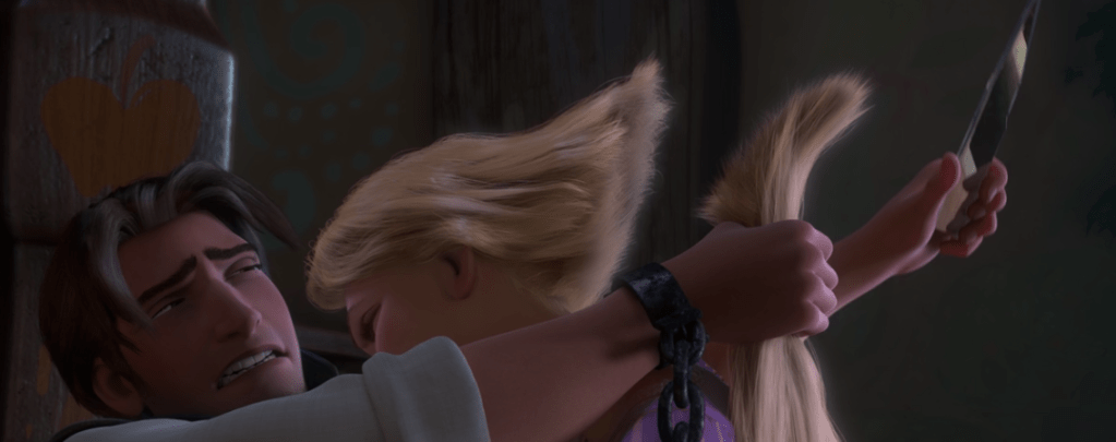 Tangled: Rapunzel’s grand gesture is agreeing to go with Mother Gothel if she can save Eugene’s life. Eugene’s grand gesture is cutting Rapunzel’s hair so she can be free, even if it means she can’t heal him.
